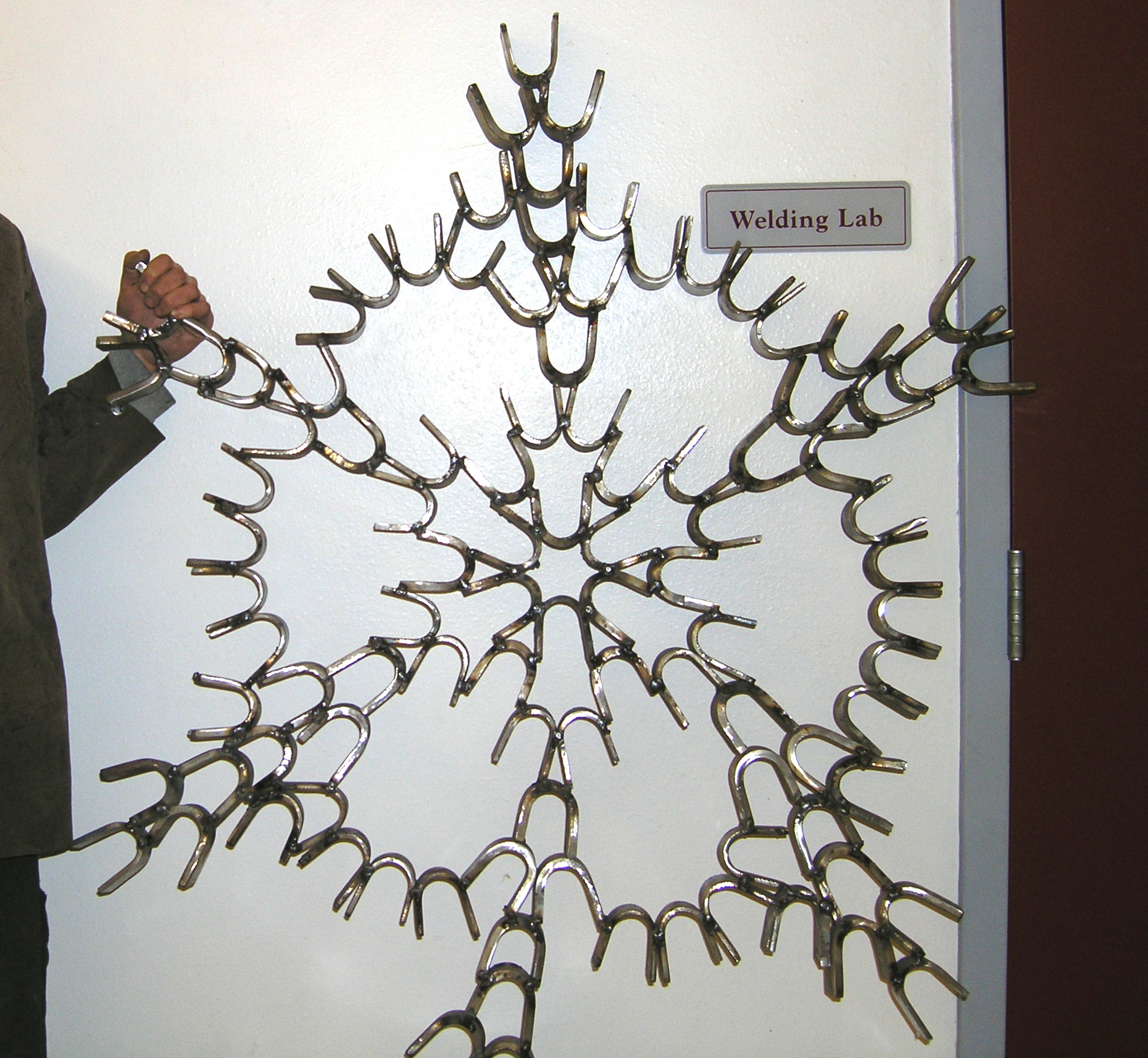 Unfortunately, I got overzealous with detail on my plasma cutting designs. My teacher told me that they would require a sheet of metal “as big as this wall,” which the school does not have to spare. Eh, lesson learned. Instead, I made a waist high snowflake out of scrap metal and tiny metal flowers that you can hold in your palm.