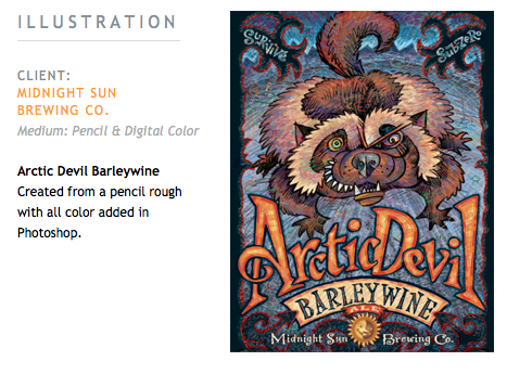 Dan Miller doesn’t know that he’s my new Graphic Design Hero. He does logos, print, and illustration. My favorite includes when he mixes the two, such as in the very recognizable Midnight Sun Brewing labels. The example below is from his website.